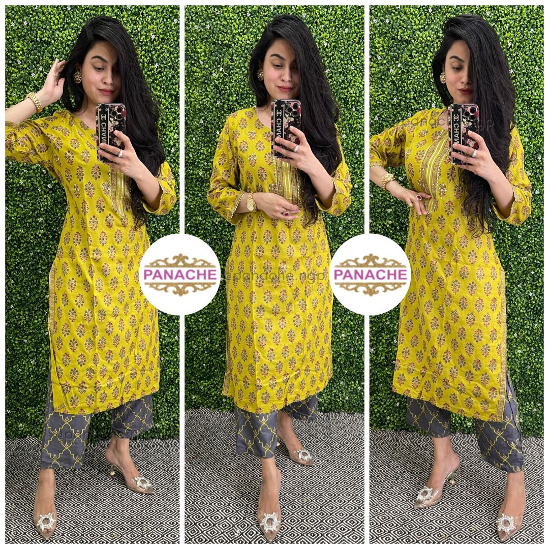 🟣 Details - Machine embroidery on neckline of kurta with printed plaso