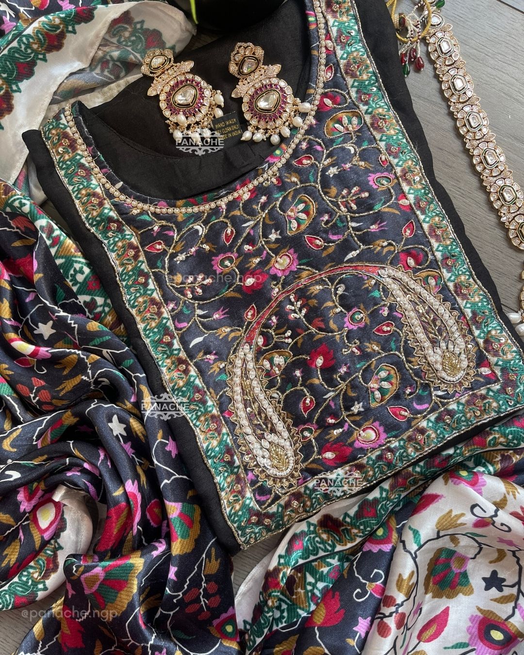 🟣 Appliqué neckline with handwork highlights and a ikkat Kalam Kari dupatta with gajji borders