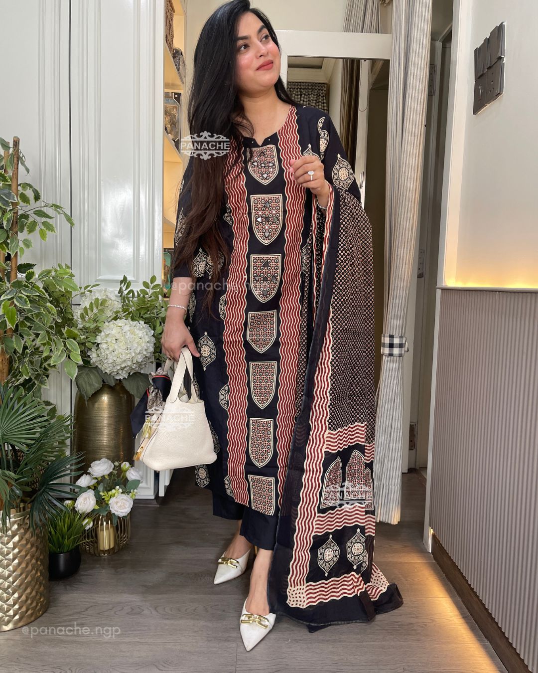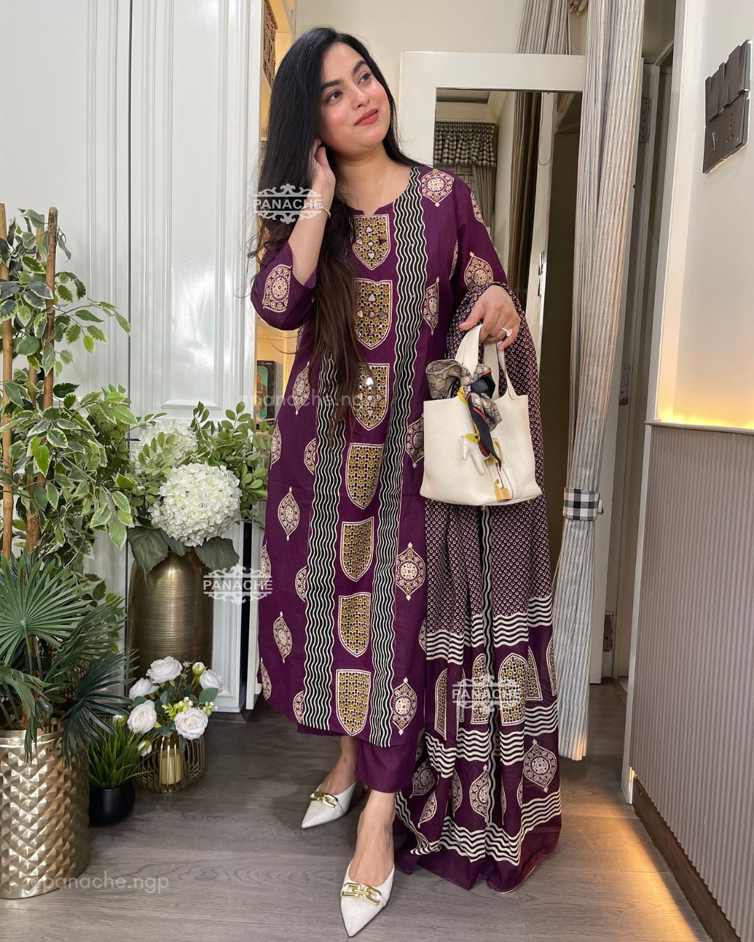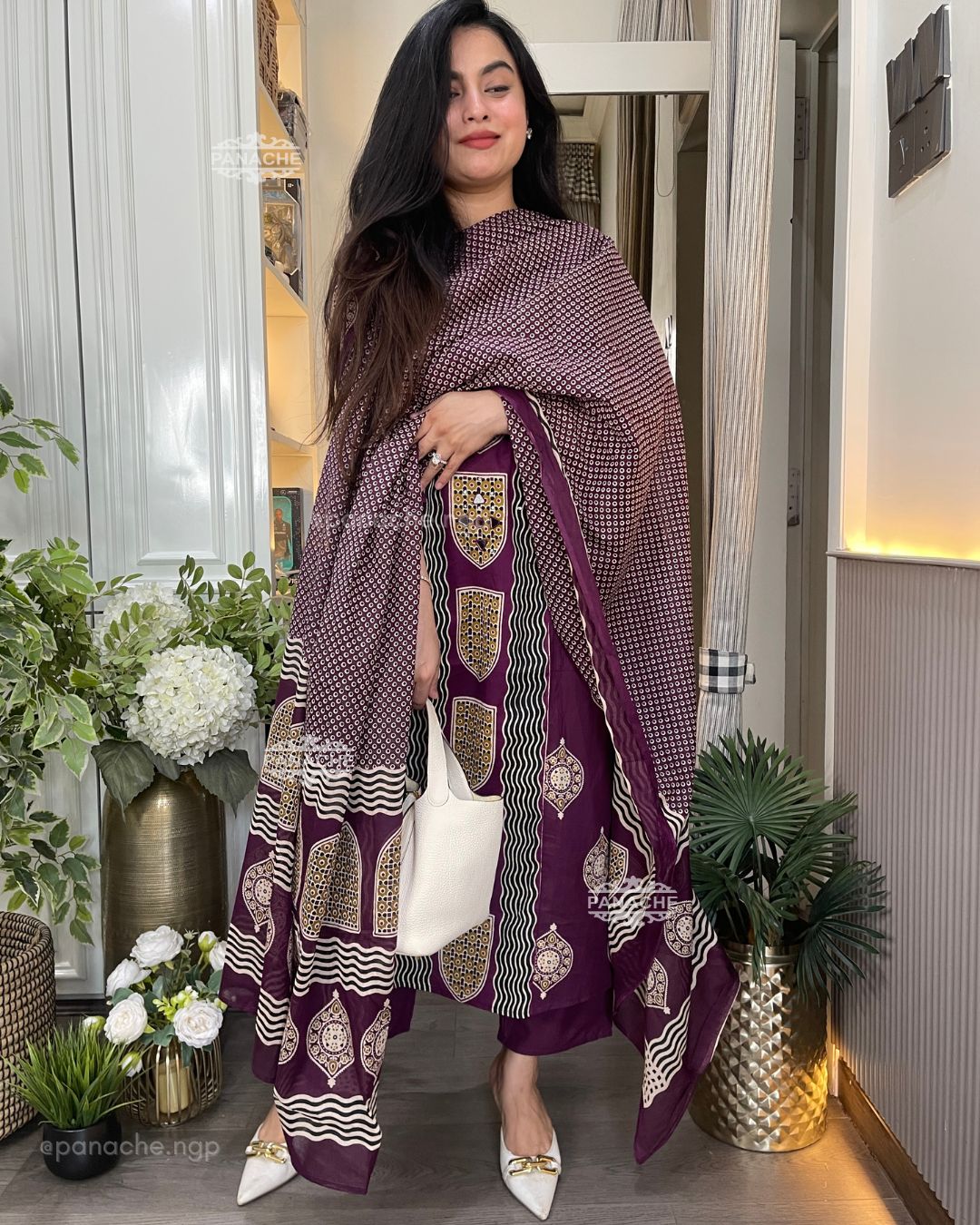 🟣 Real mirror all over the kurta with Varli inspired block printing all over