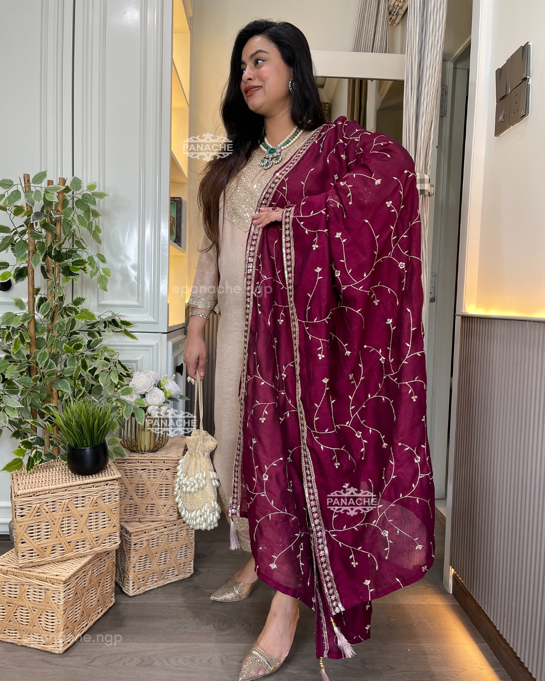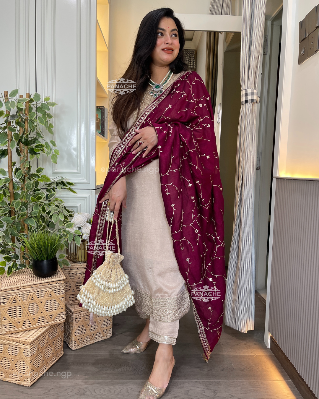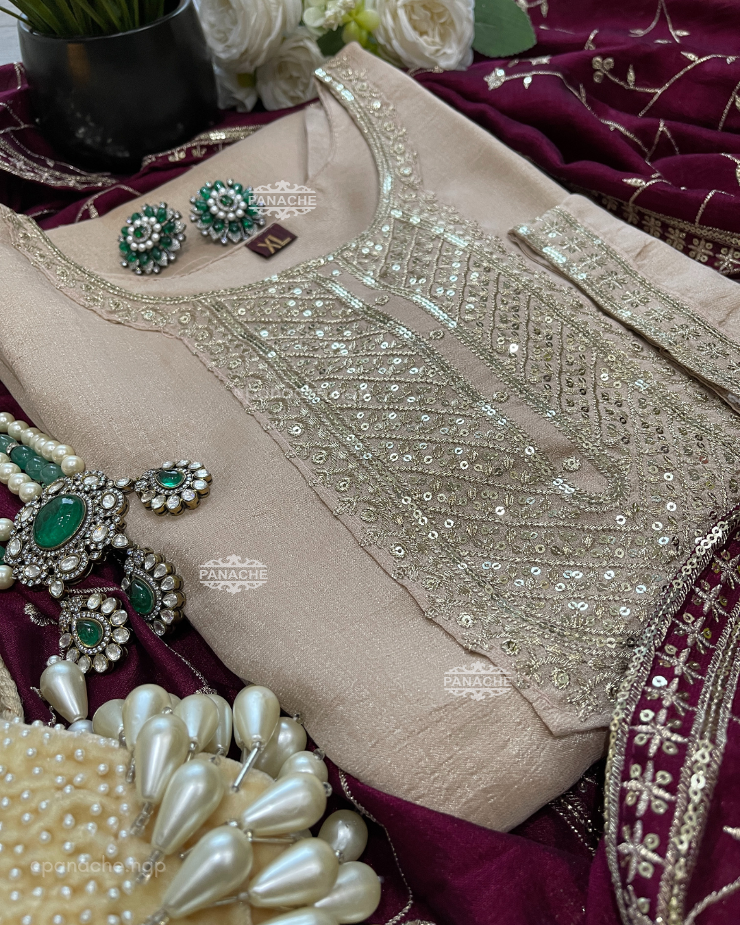 🟣 Pittan neckline with similar Daman sleeves and a heavy dupatta