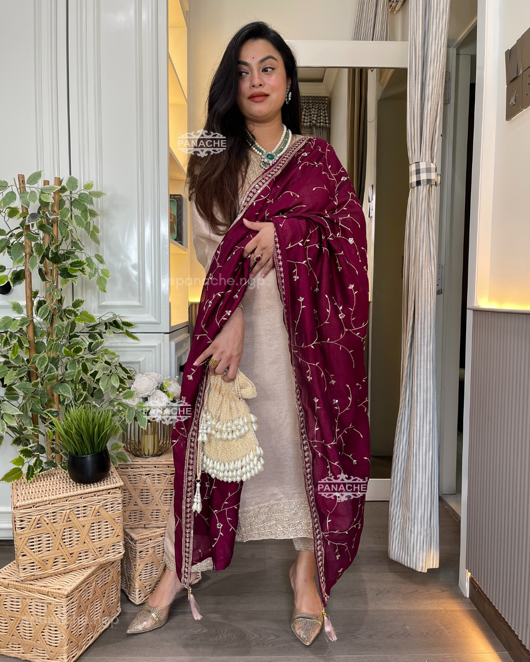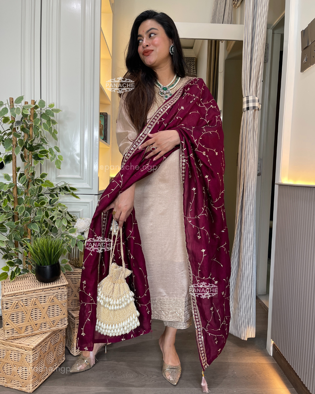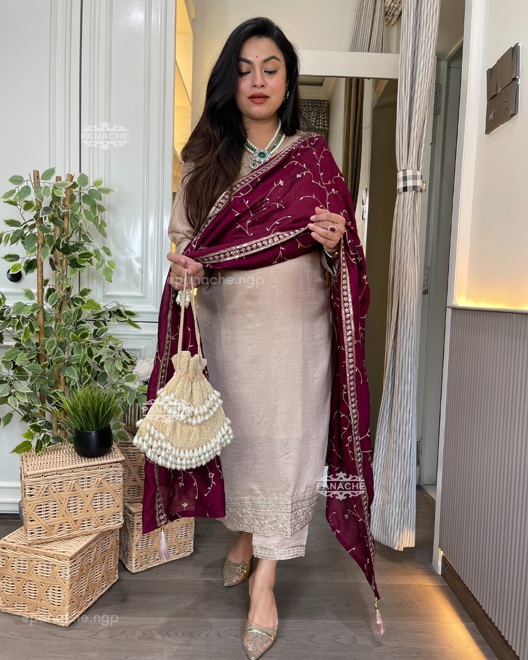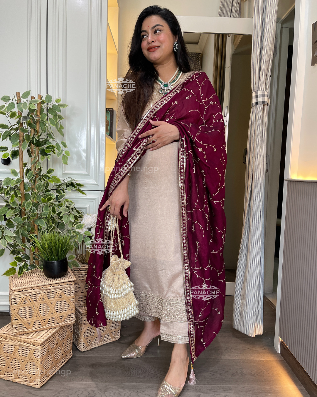 🟣 Pittan neckline with similar Daman sleeves and a heavy dupatta