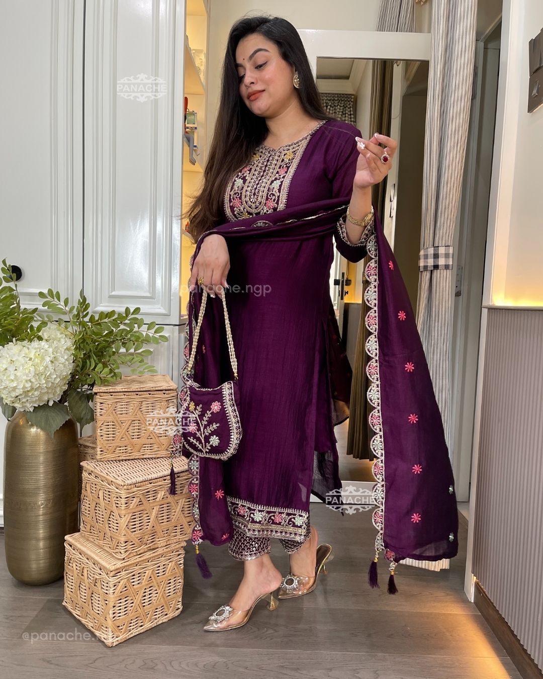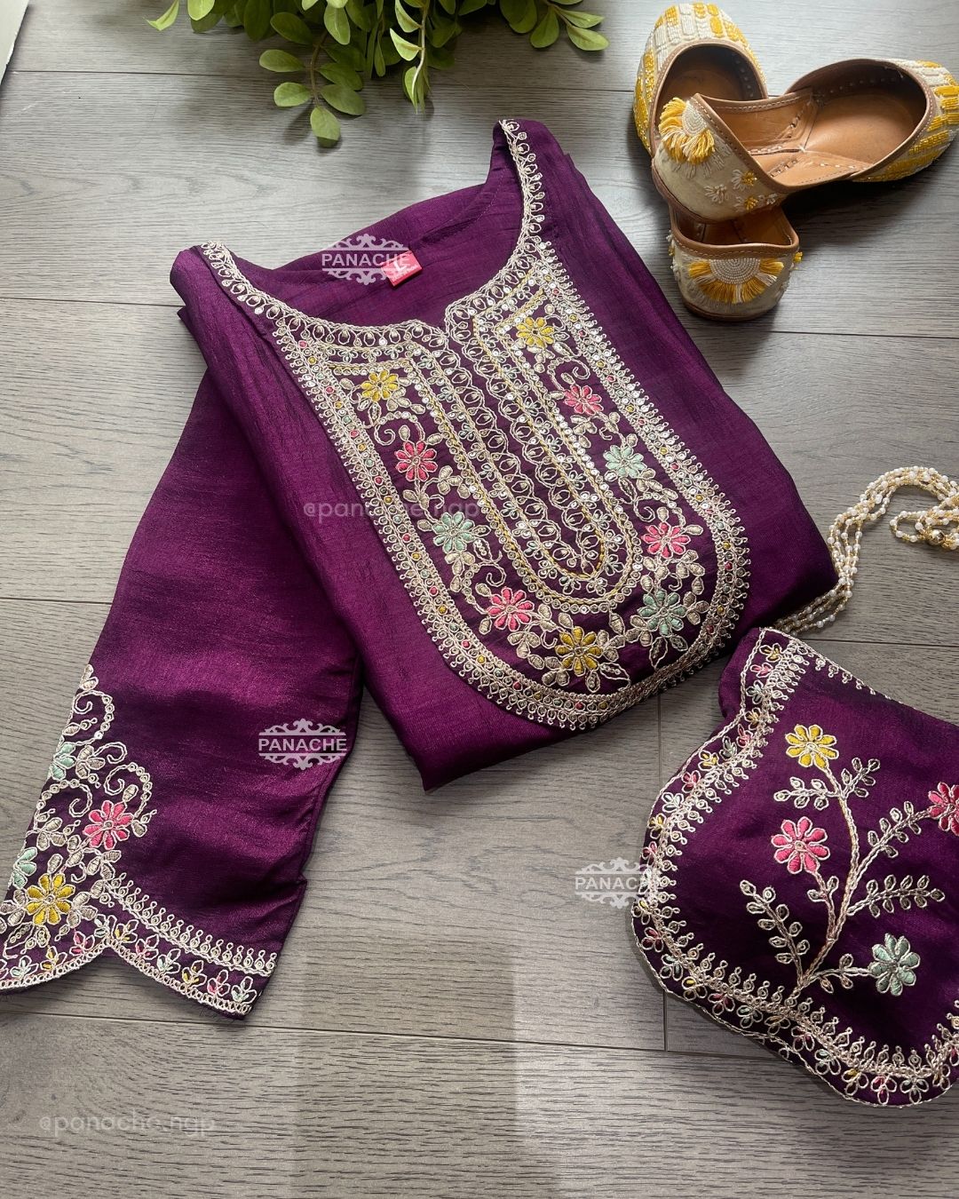 🟣 Embroidered neckline with heavy sleeves and pants, detailed dupatta and heavy zari Potli