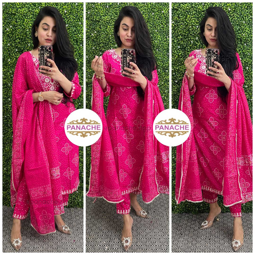 🟣 A vibrant daily wear cotton set with machine embroidery on neckline , pants, and dupatta daman ,Crosia lace on all 4 sides of dupatta