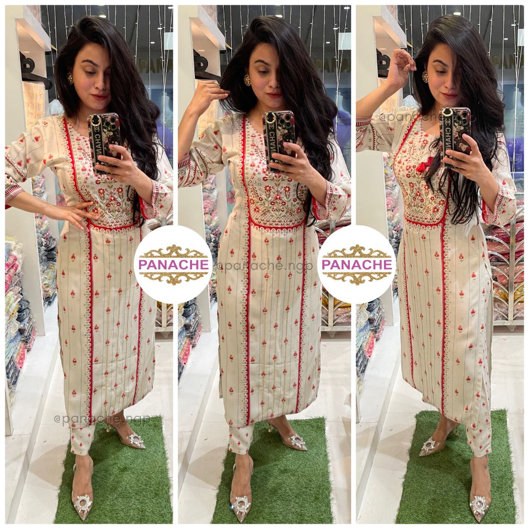 🟣 Elegant hand embroidery on kurti with print on print highlights