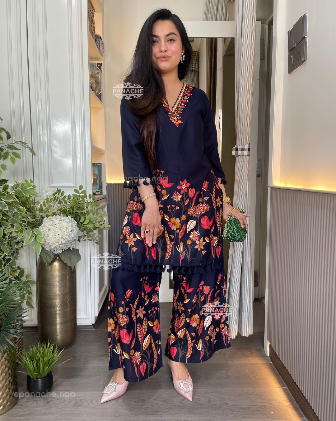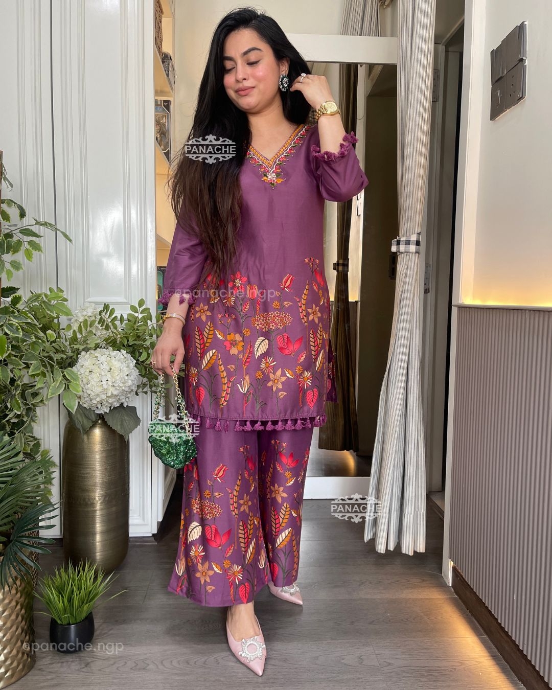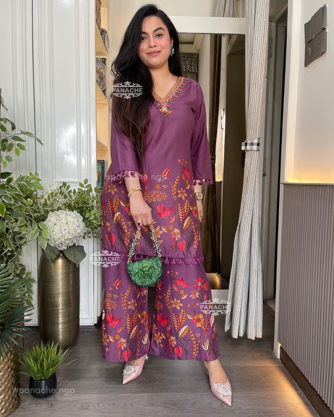 🟣 Printed Daman of top & plaso with fundas and mirror work neckline setting casual yet glam vibes