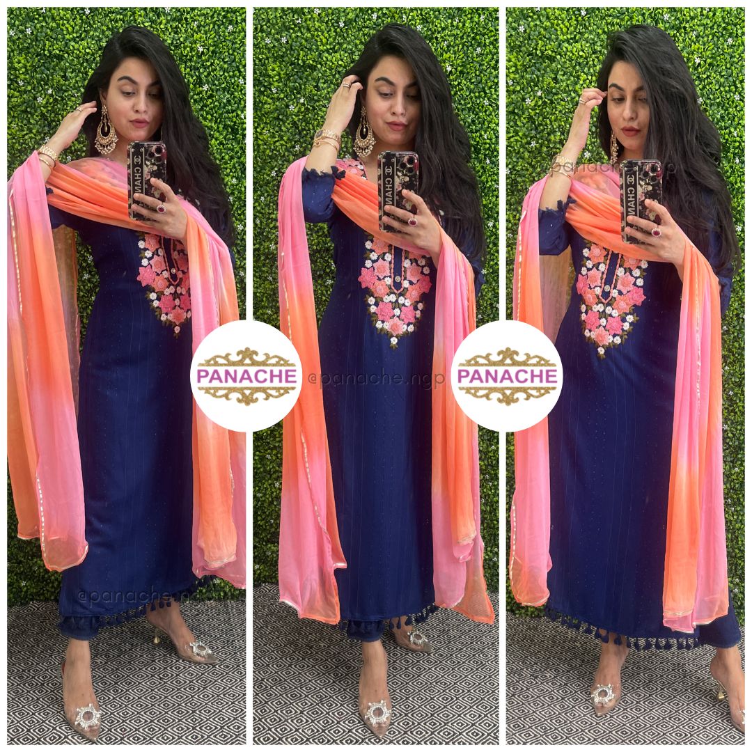 🟣 Details - 3D floral embroidery on neckline of kurta and over all self sequin on kurta with stretchable and beautifully fitted pants