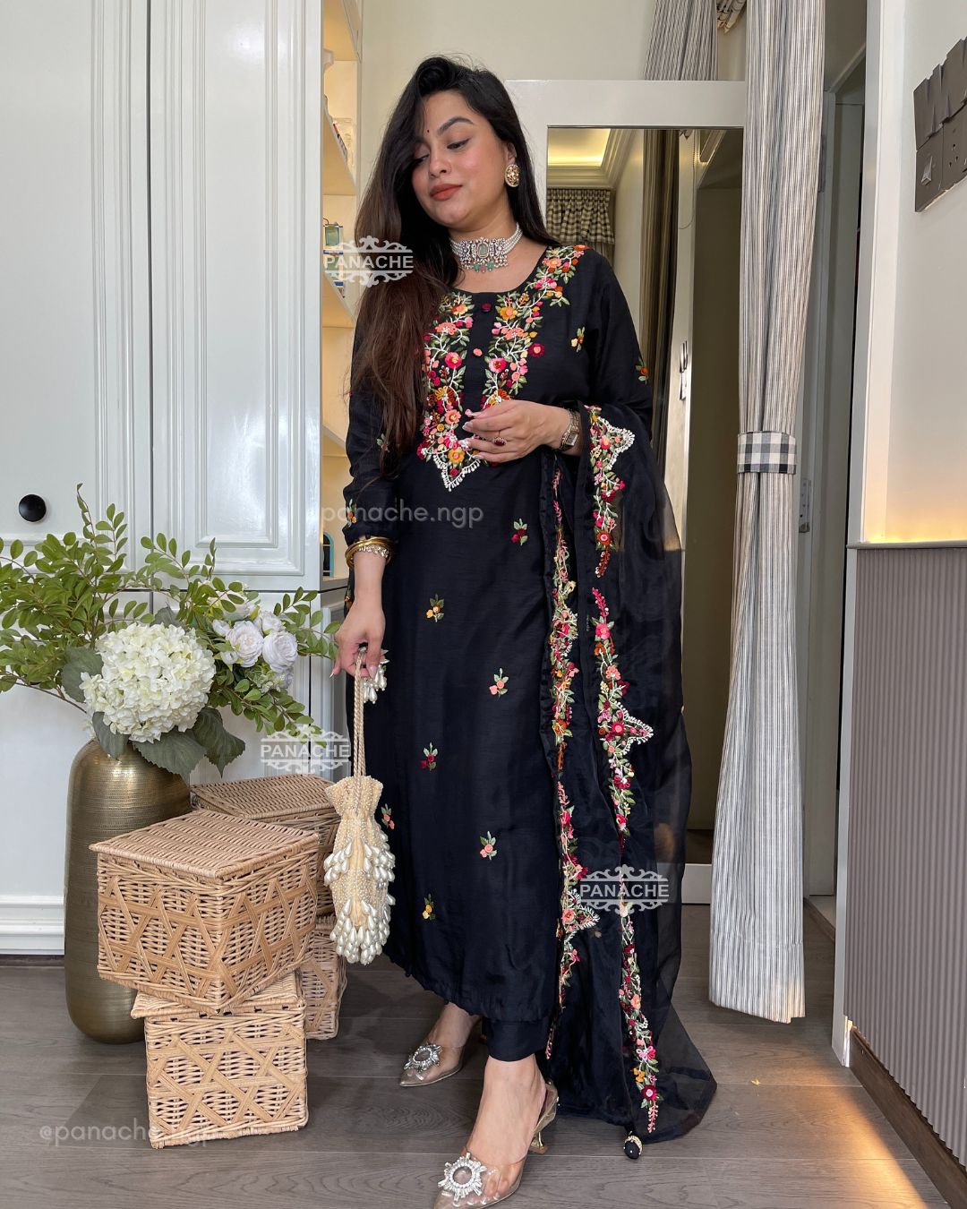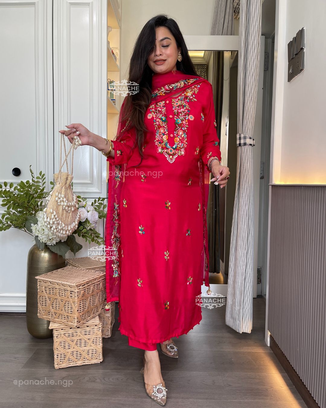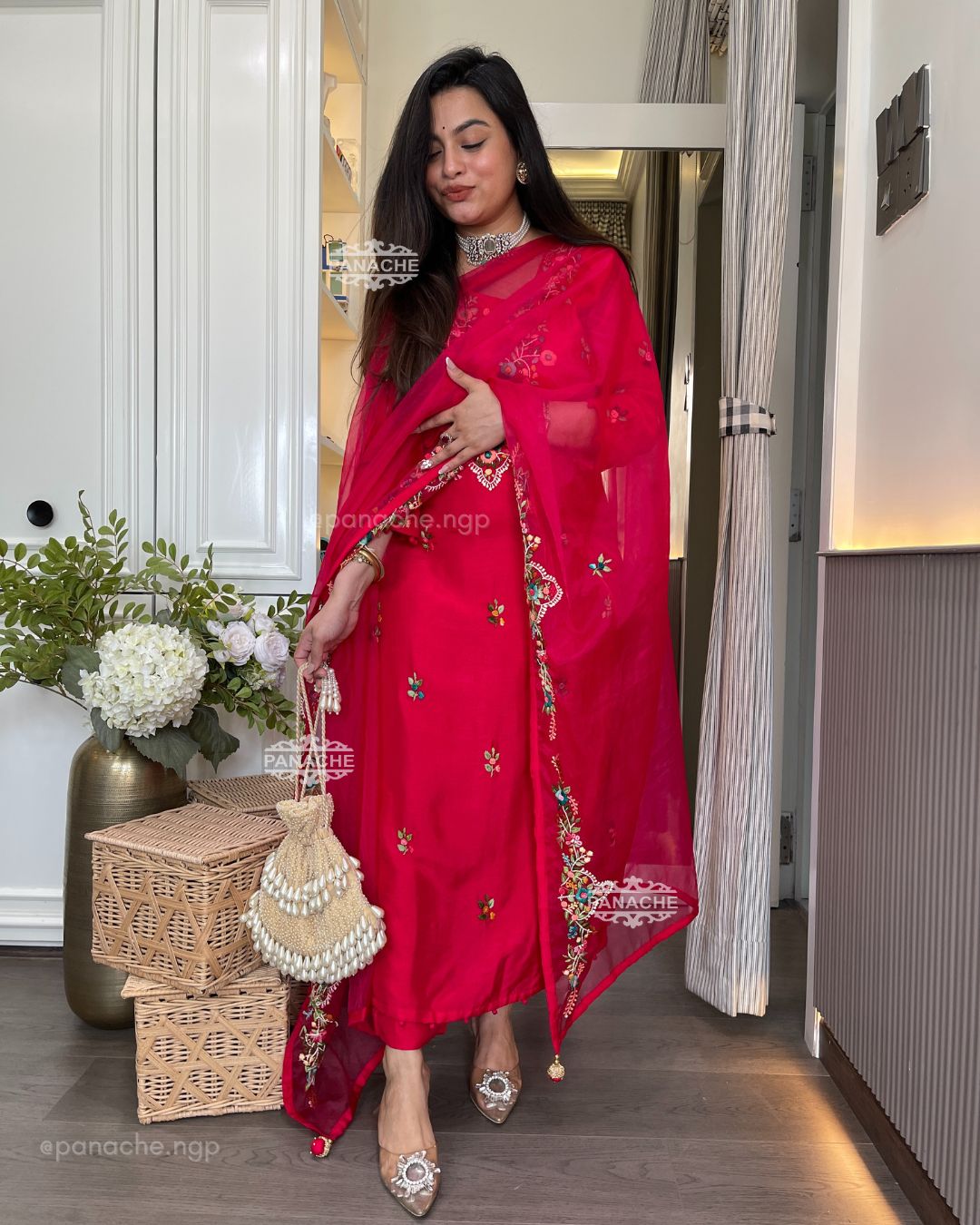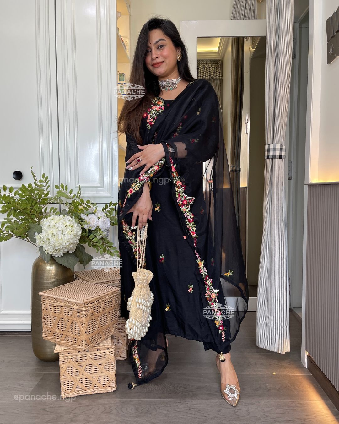 🟣 Frenchknott embroidery on kurta with side tassels and embroidery like garden on sleeves, heavy dupatta with buttas all over kurta
