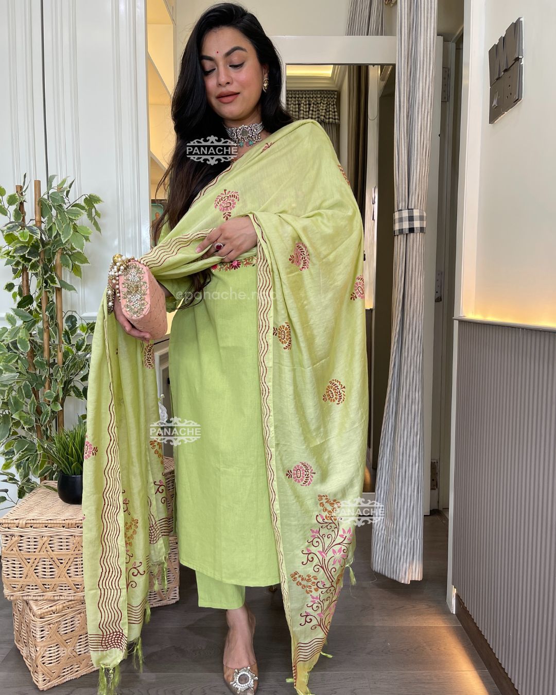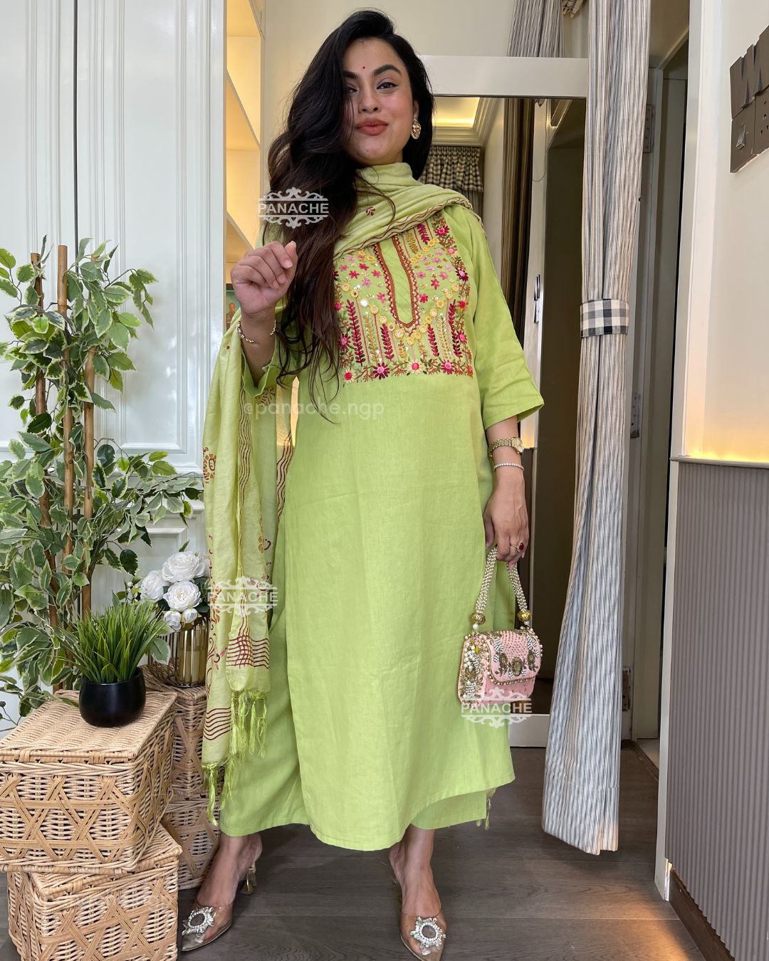 🟣 A organic cotton set with frenchknot neckline and handblock dupatta soft to touch