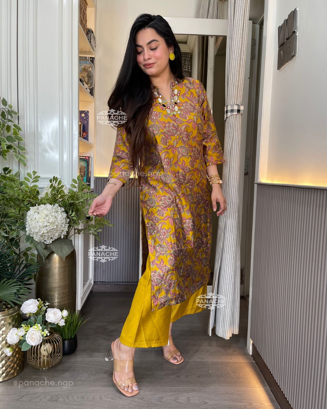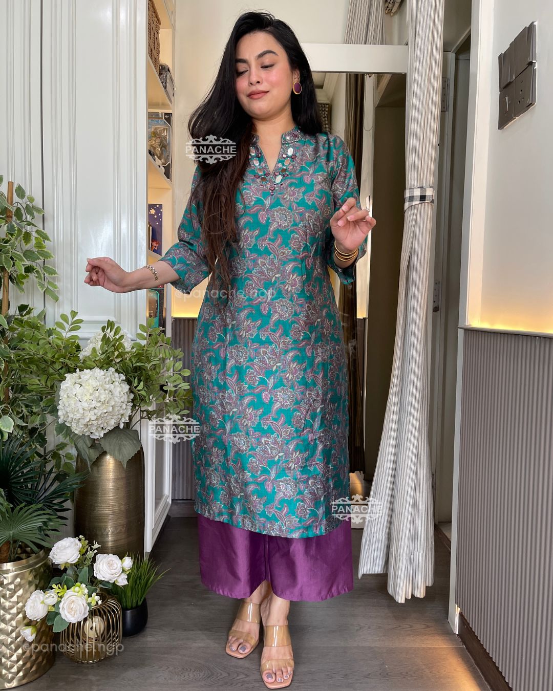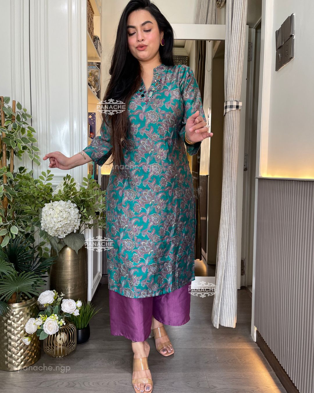 🟣 Beautiful printed coords with real mirror work neckline and plaso style teamed with button earrings (Complimentary with the outfit)