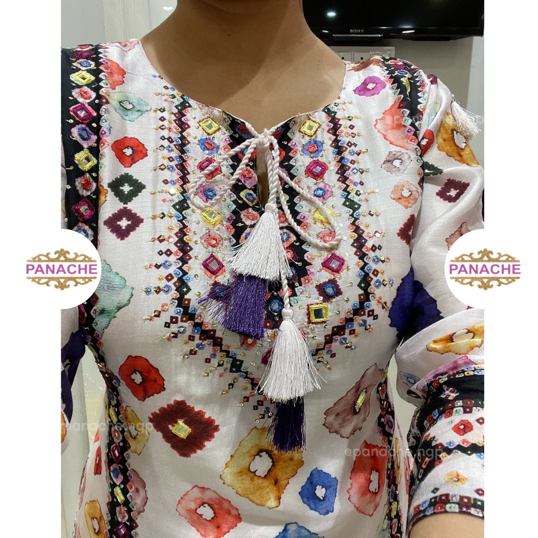 🟣 Printed kurta with mirror work highlight and plain pants