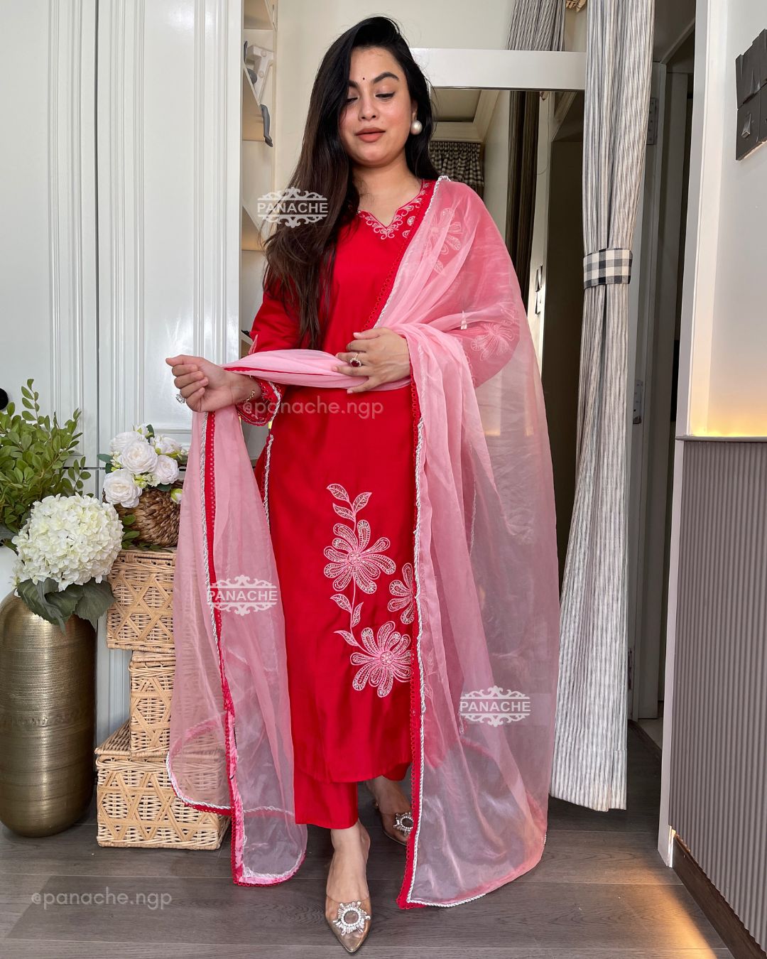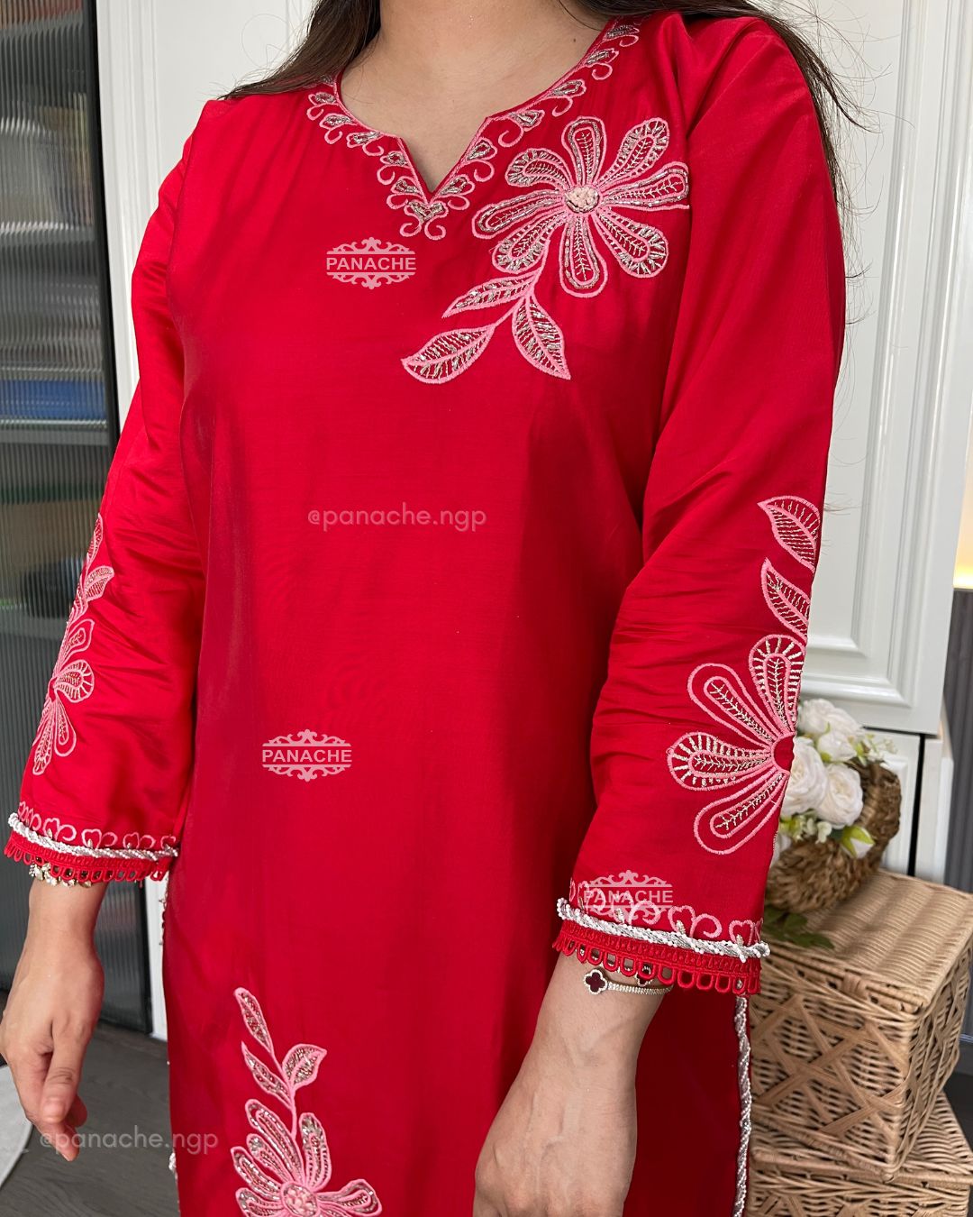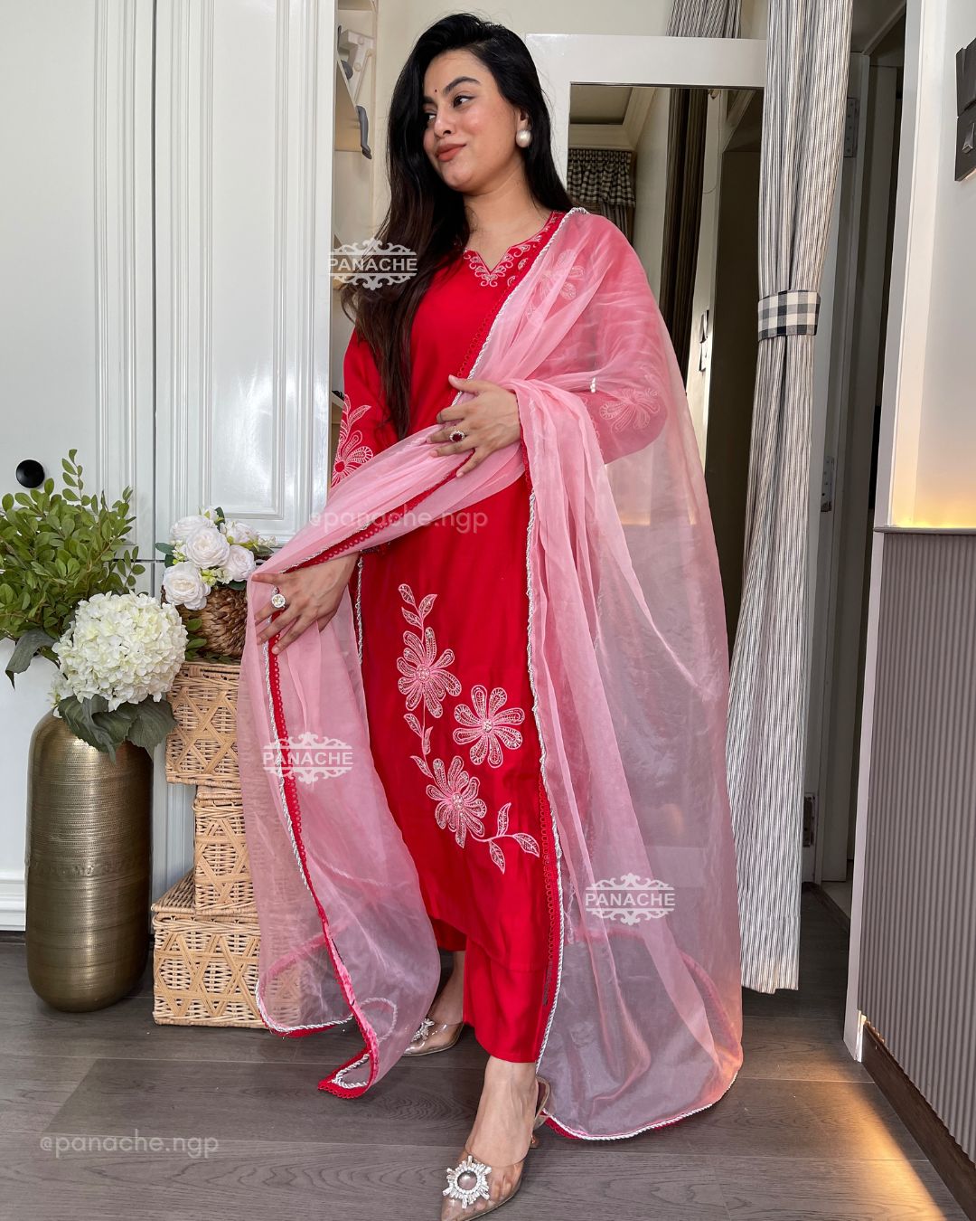 🟣 Embroidered kurta with loop lace and pearl lace details on sleeves & side slits, heavy dupatta