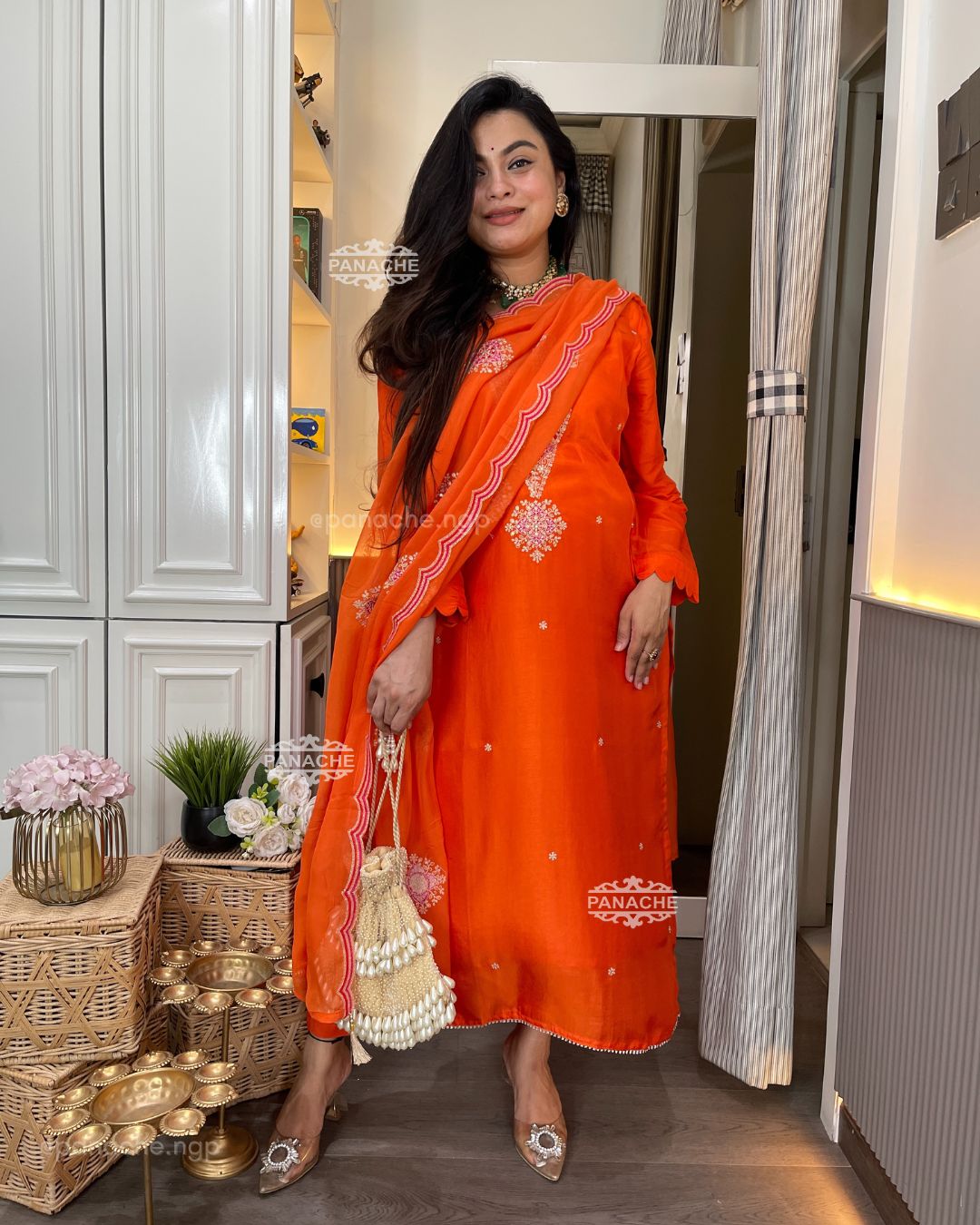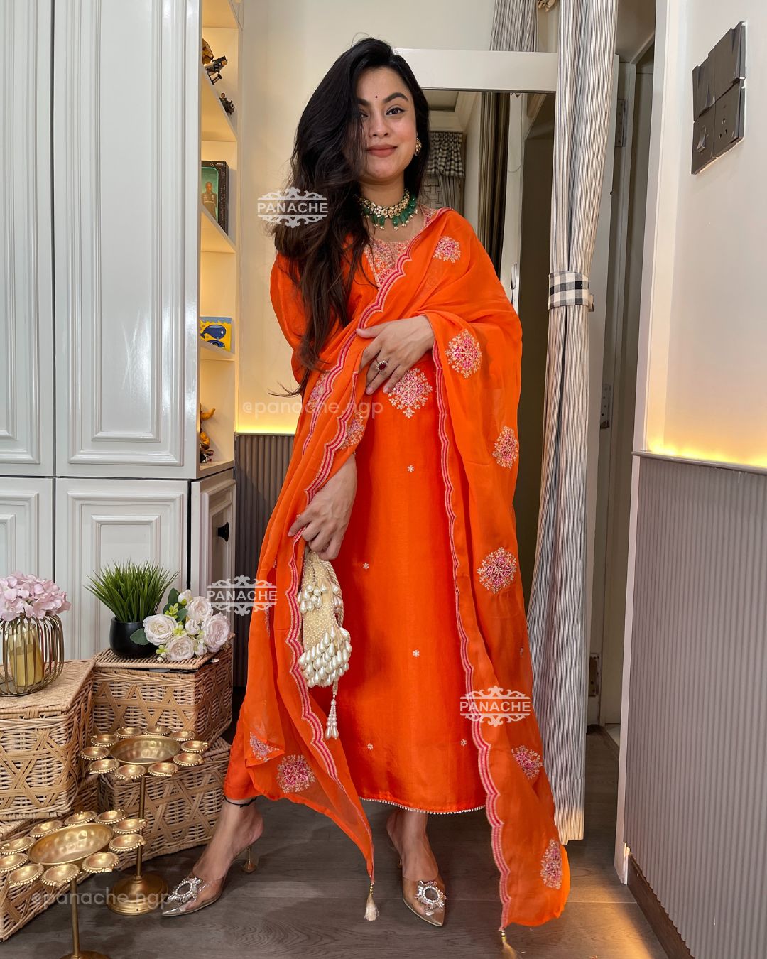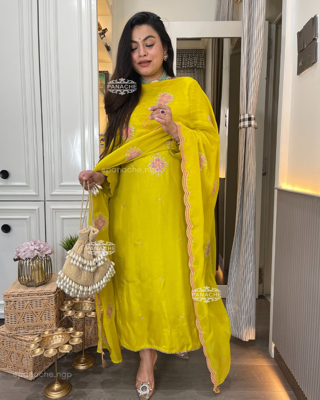🟣 Heavy embroidered neckline with scalloped dupatta and buttas all over on kurta with elegant scallop sleeve detail