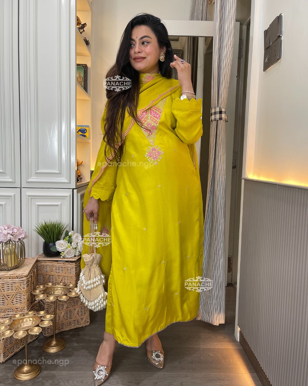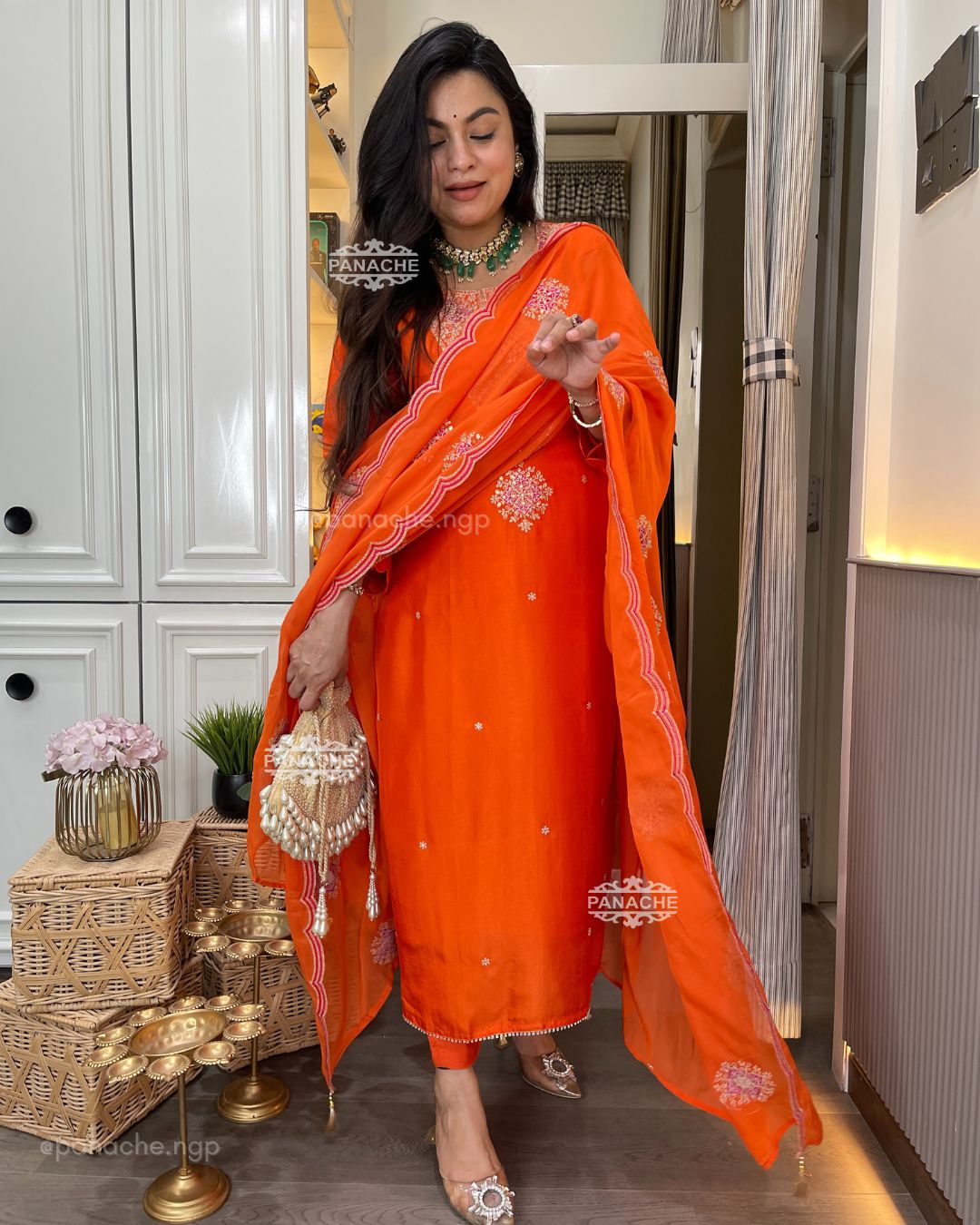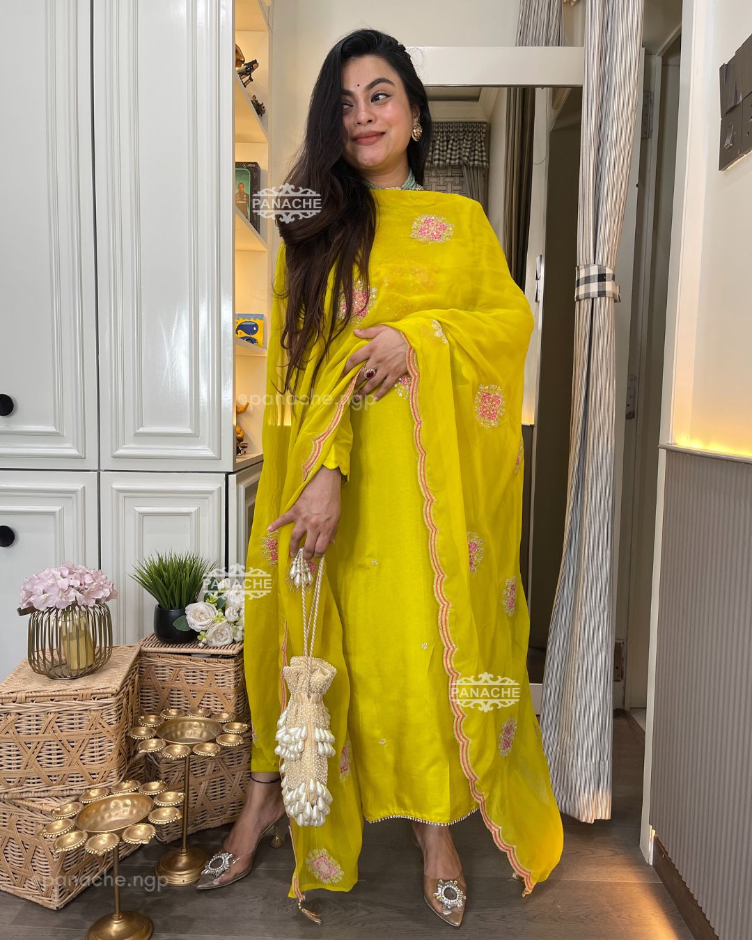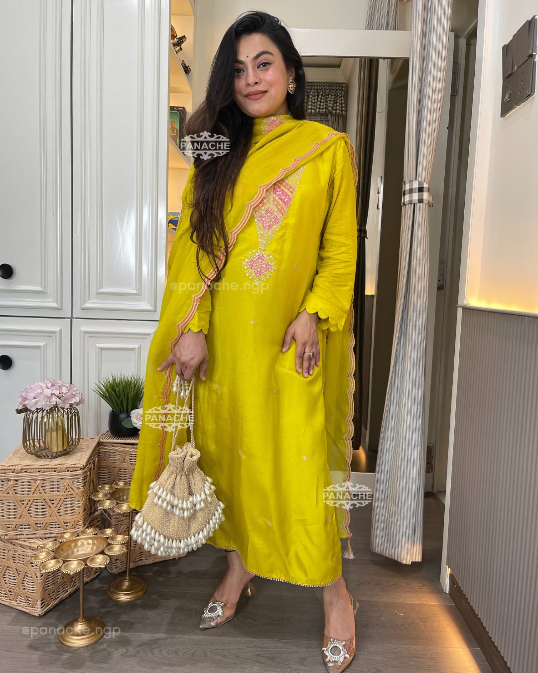 🟣 Heavy embroidered neckline with scalloped dupatta and buttas all over on kurta with elegant scallop sleeve detail