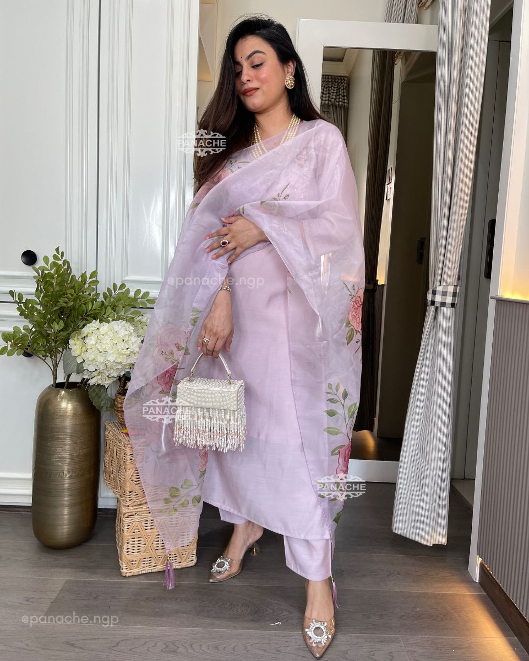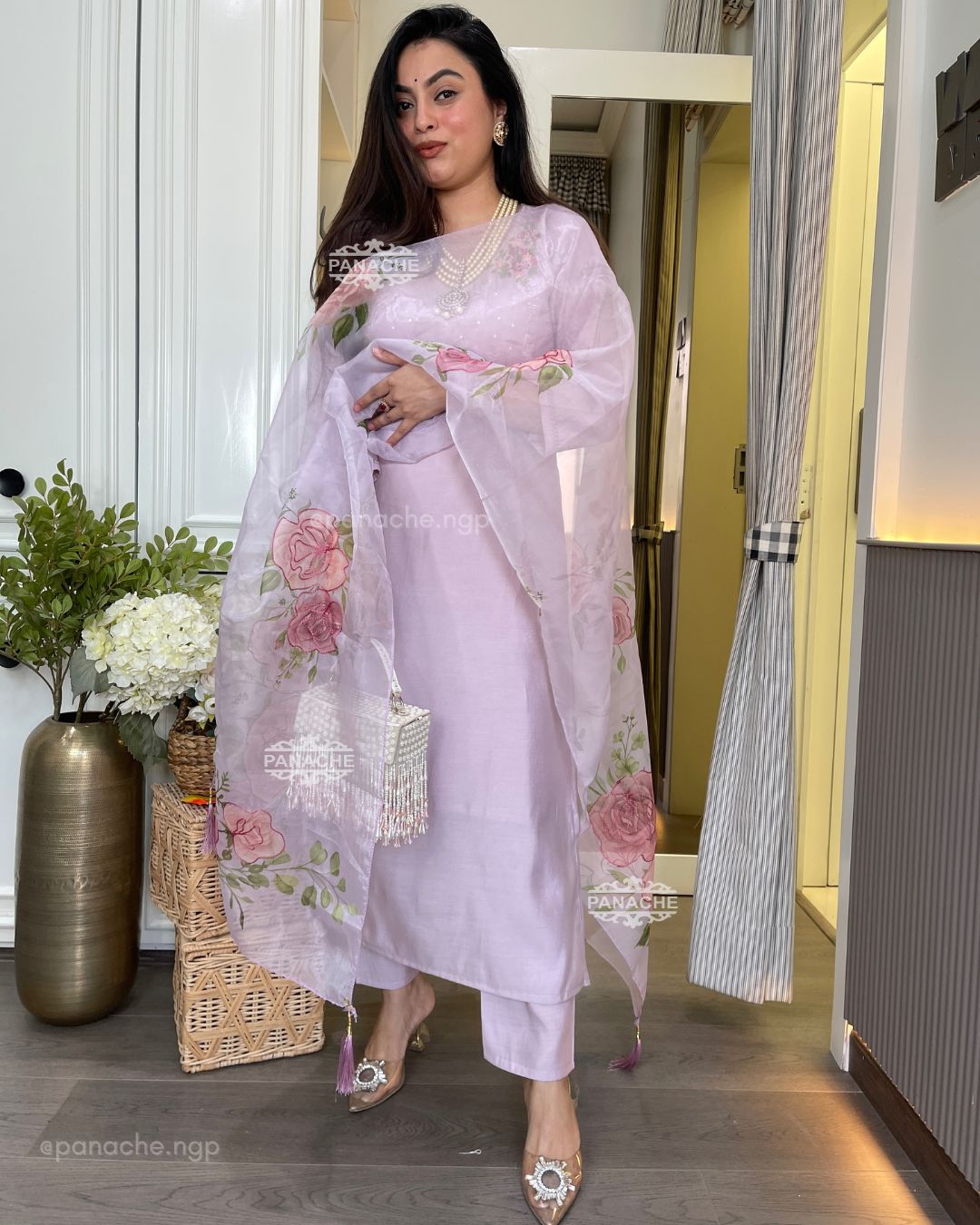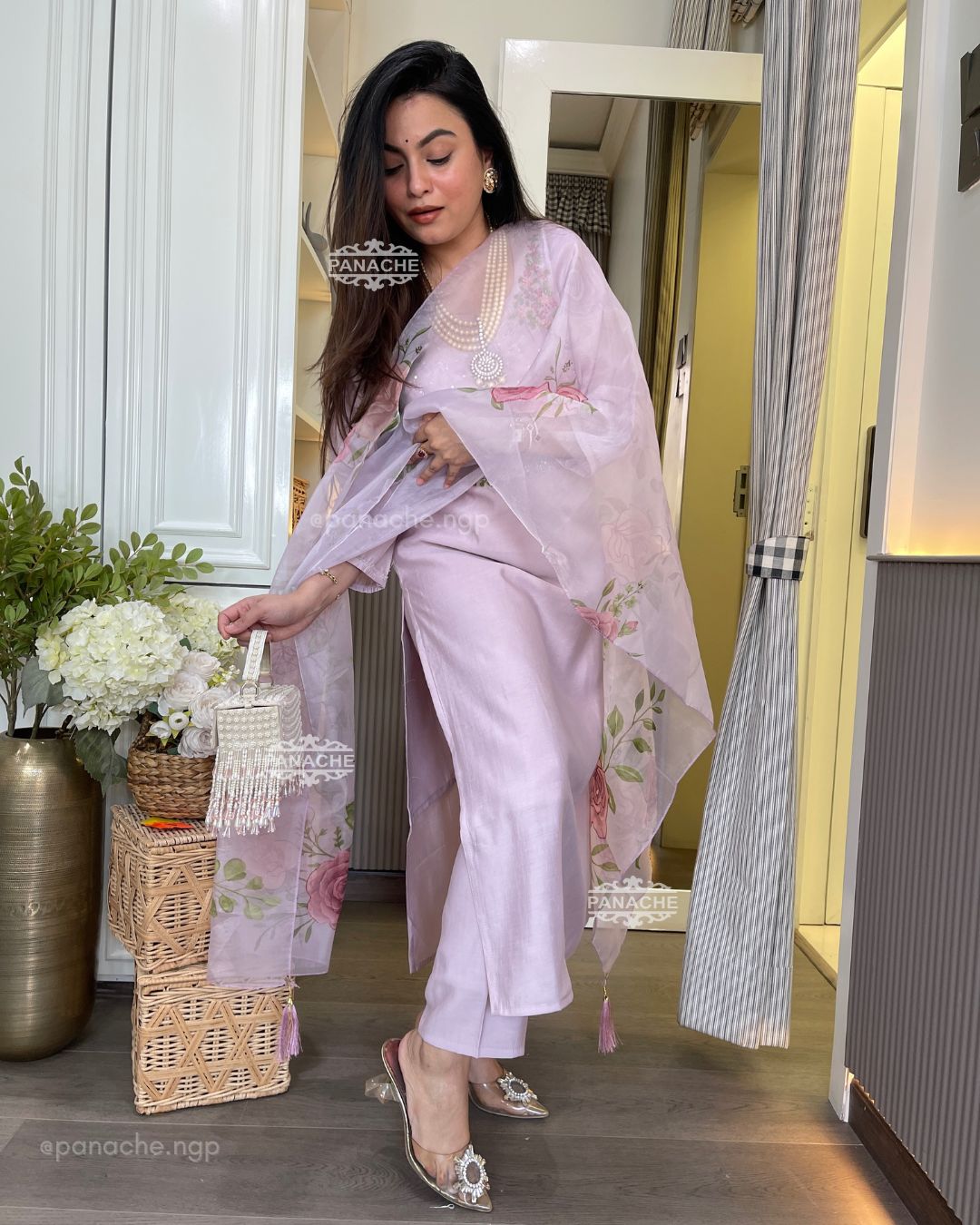 🟣 It’s the look of delicateness in a suit with floral handwork on kurta and embroidery highlights on the already floral dupatta