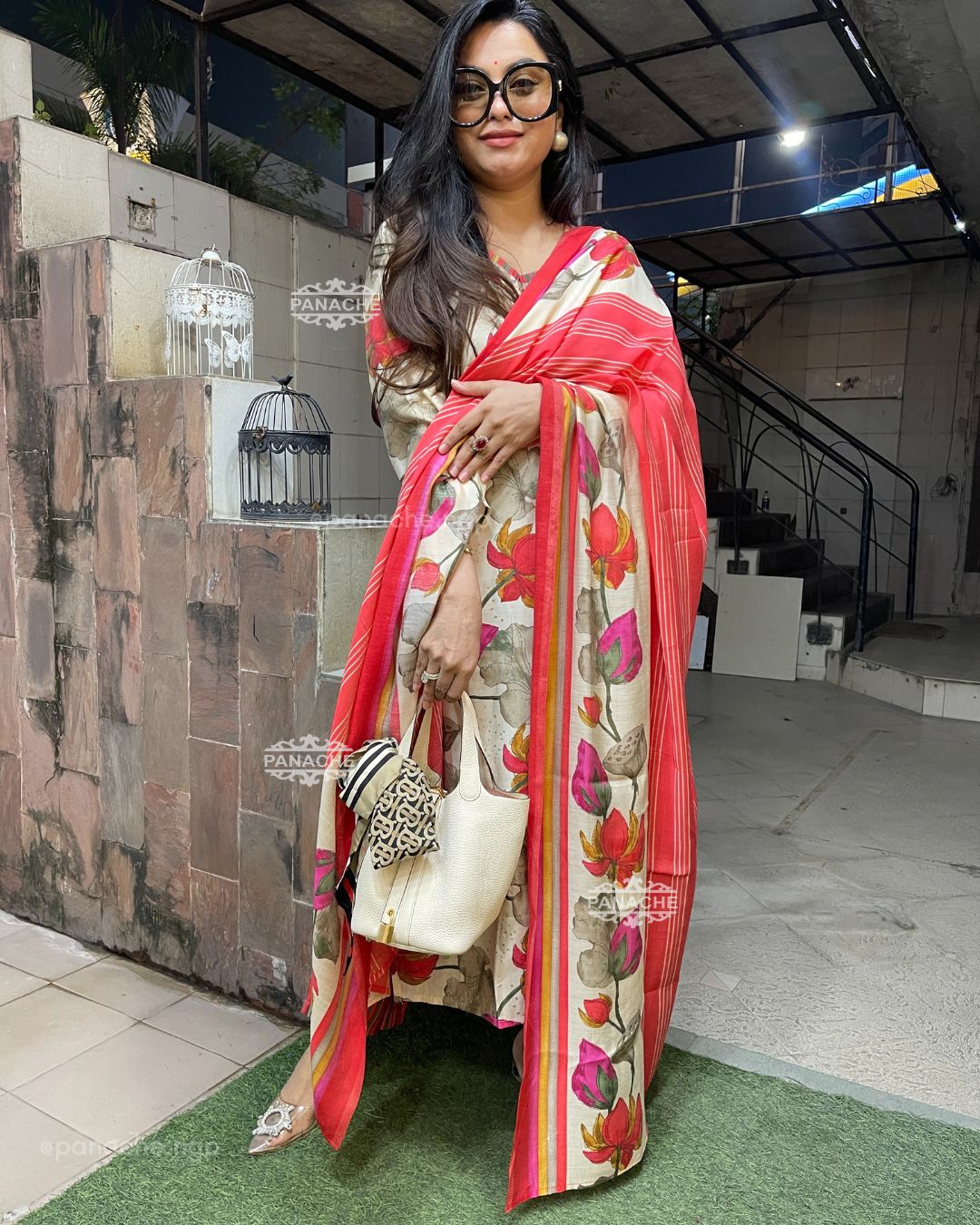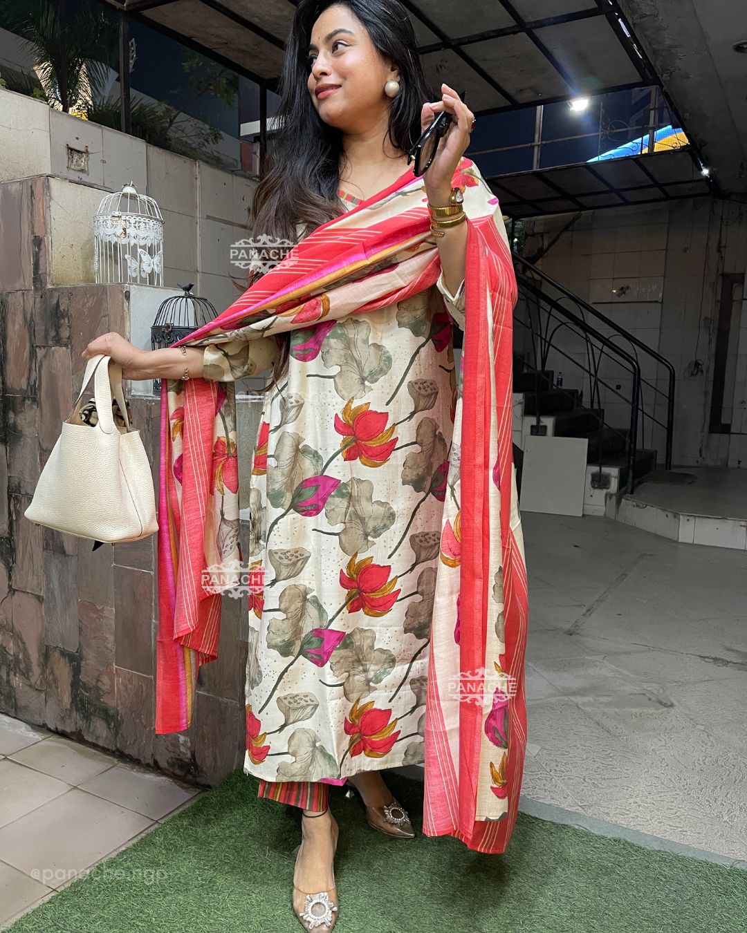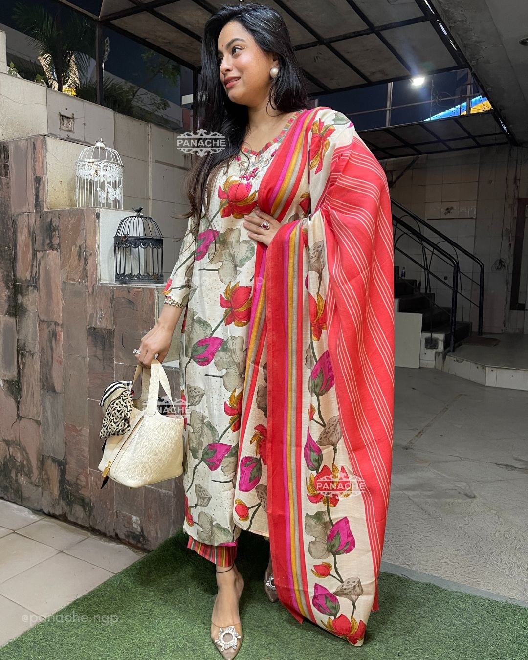 🟣 Detailed handwork neckline with print on print kurta pant set