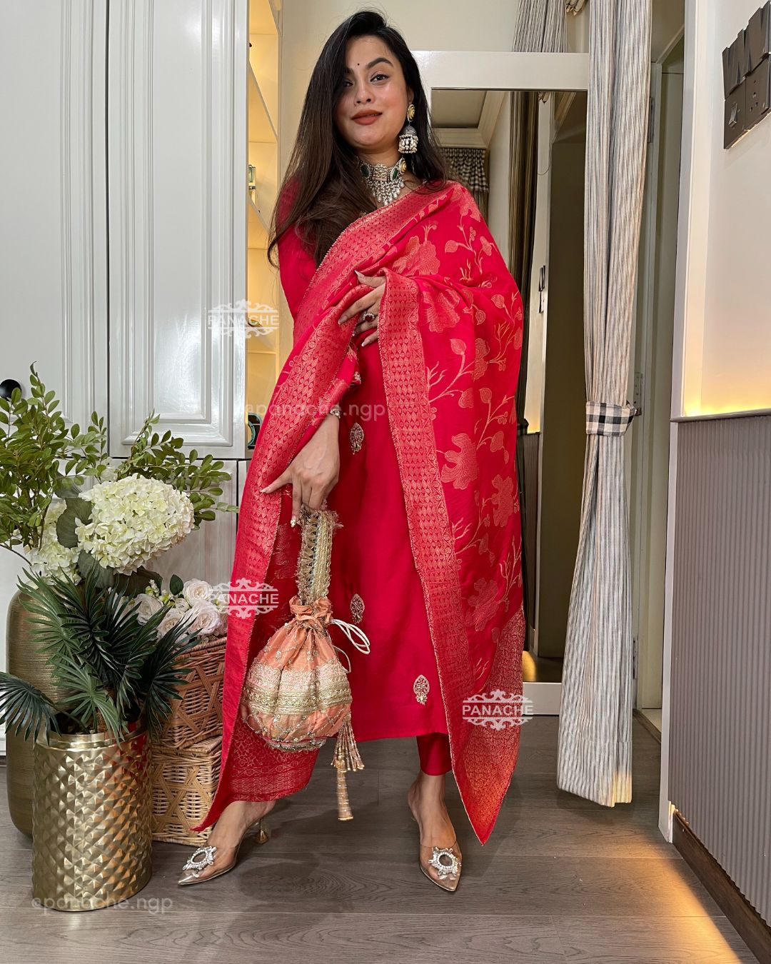 🟣 A bucket neckline with heavy work and buttas all over with hand wooven dupatta beat suited for trousseau and festive occasions at budget!