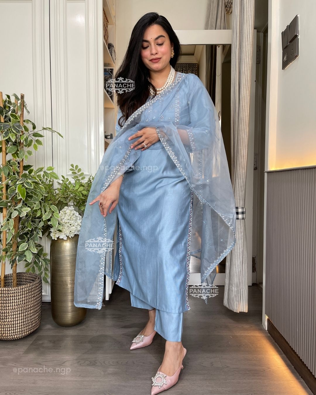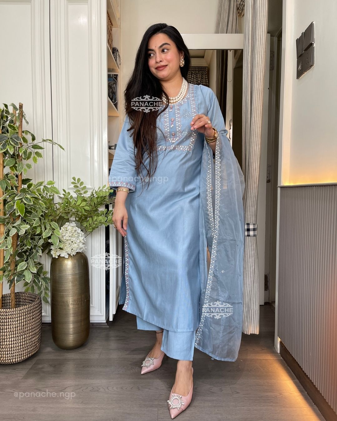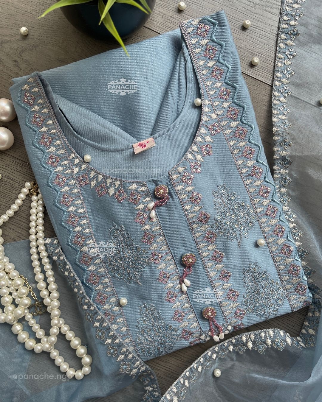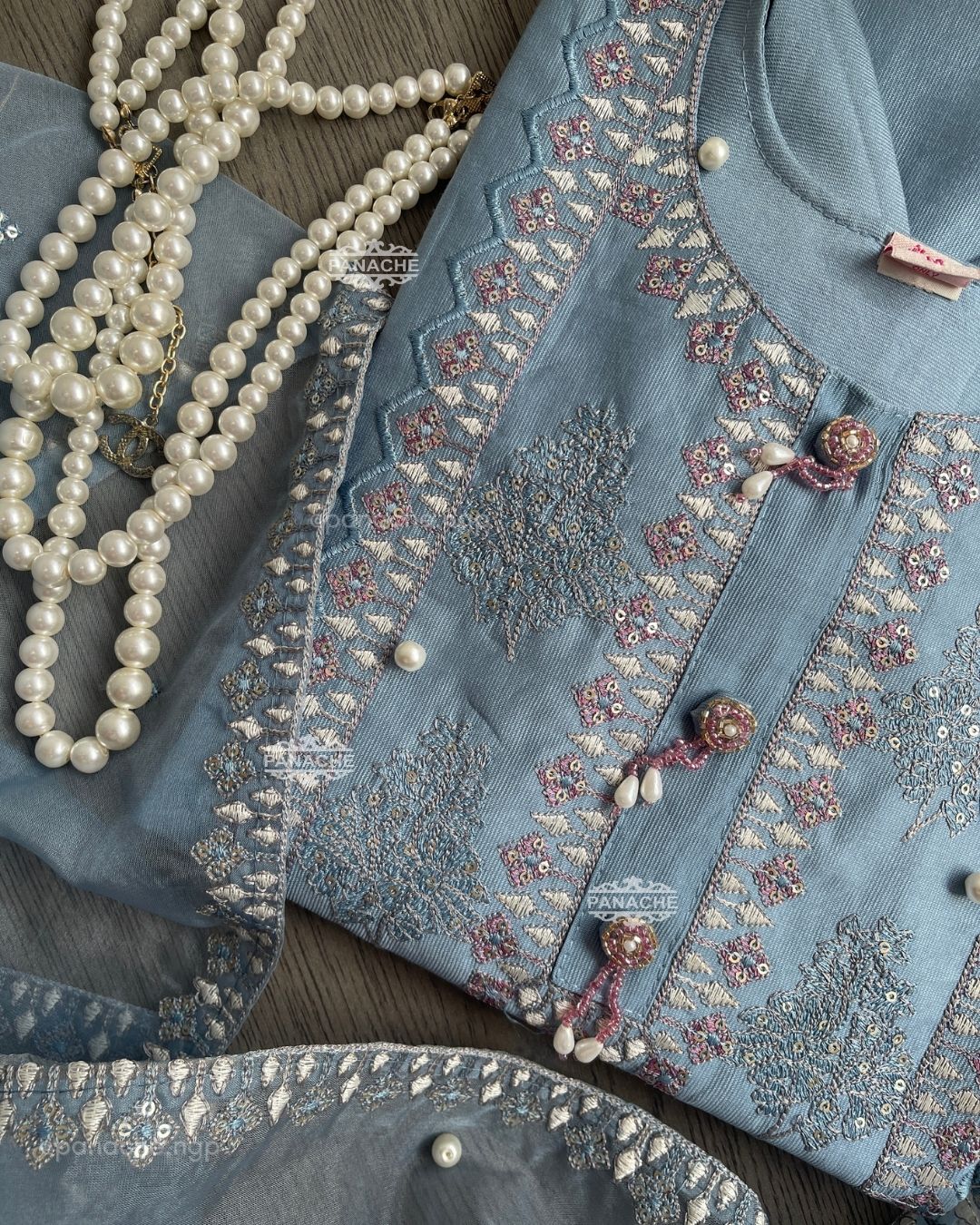 🟣 Detailed embroidered neckline with handmade tassel buttons , embroidery on hands & side slits