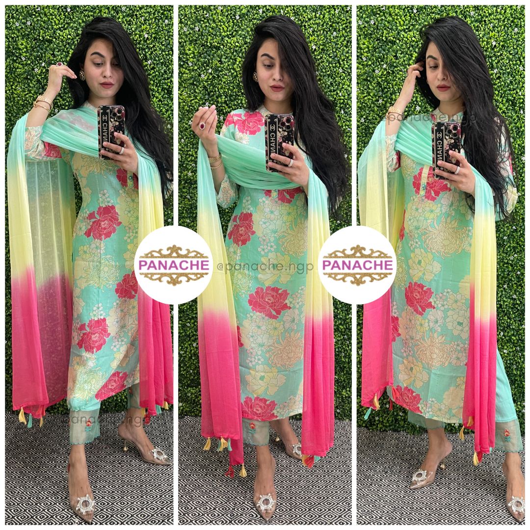 🟣 Floral stand collar kurti with self sequin and handwork highlights and a fancy pants , the shaded dupatta is big and really soft with tassels