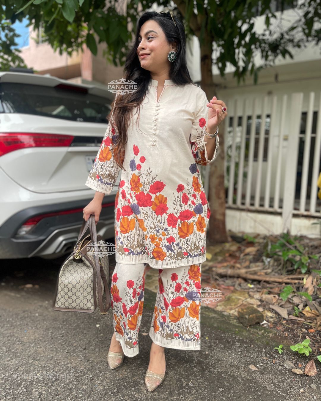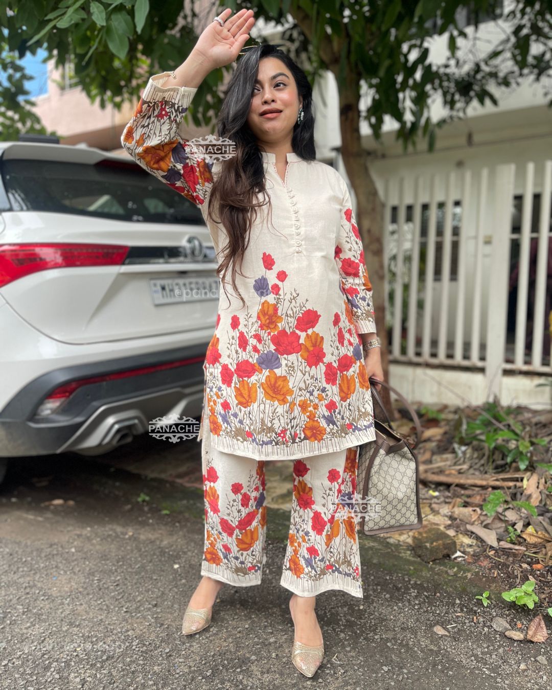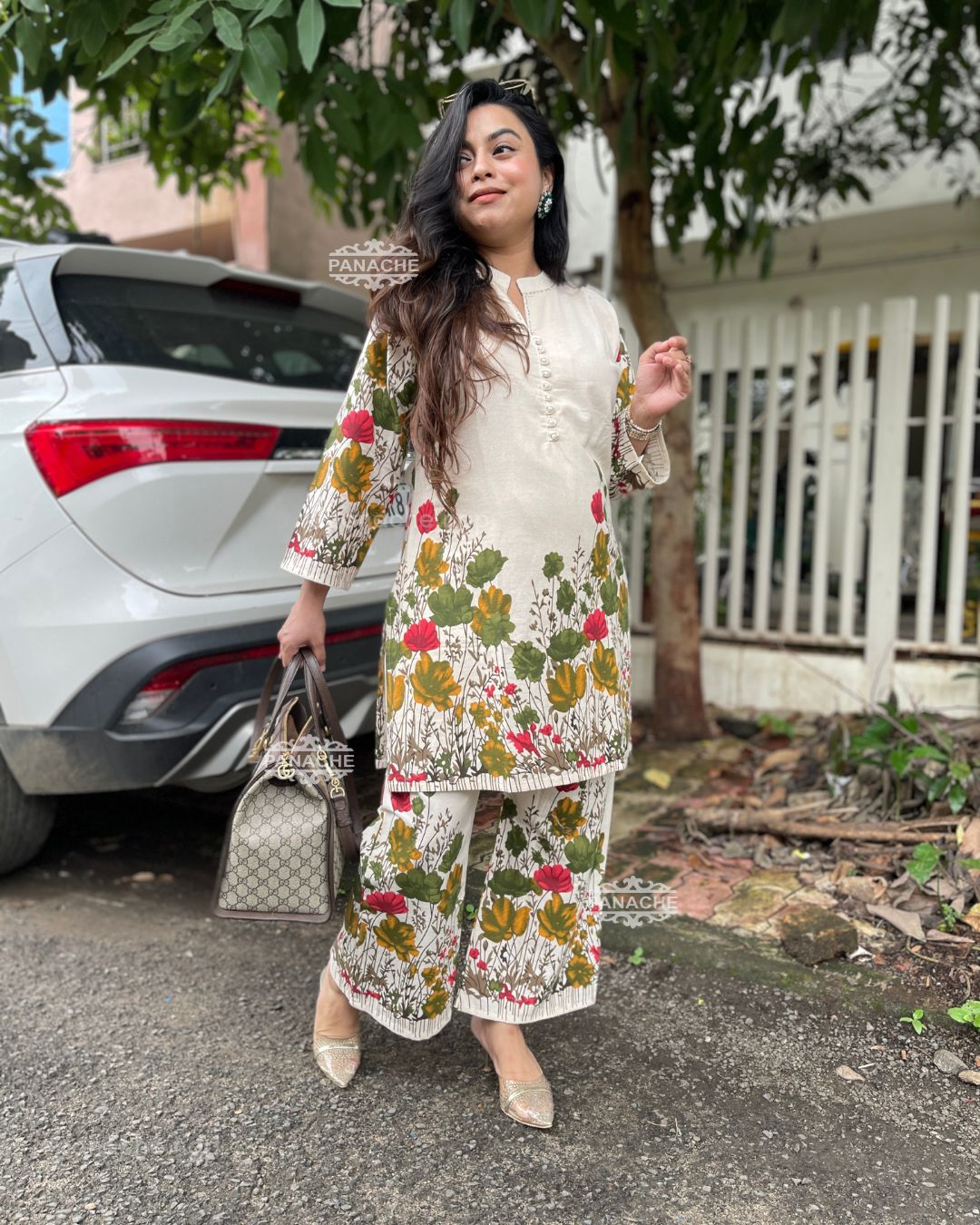🟣 Stand collar with pearl buttons on top with a tropical print in top and plaso set