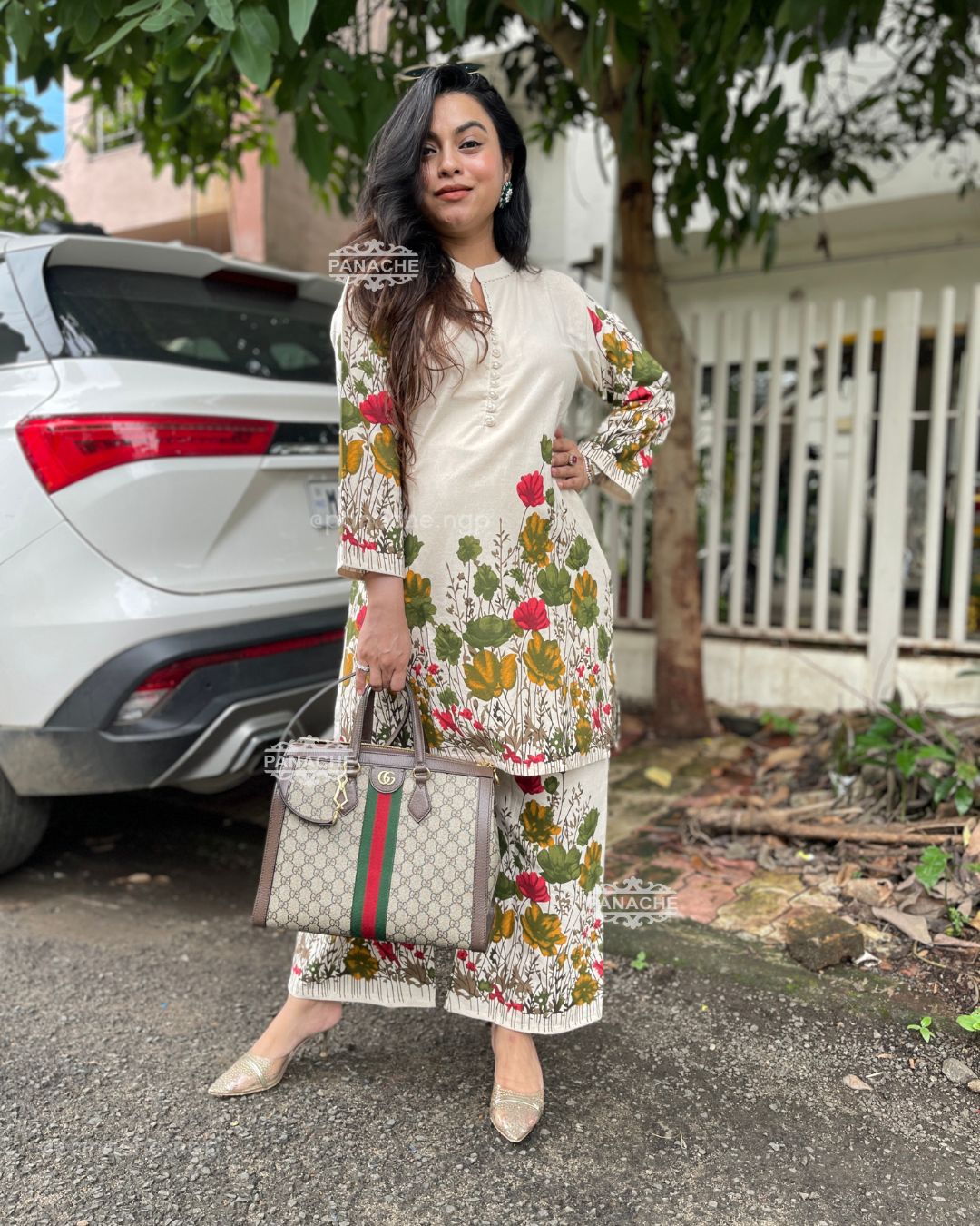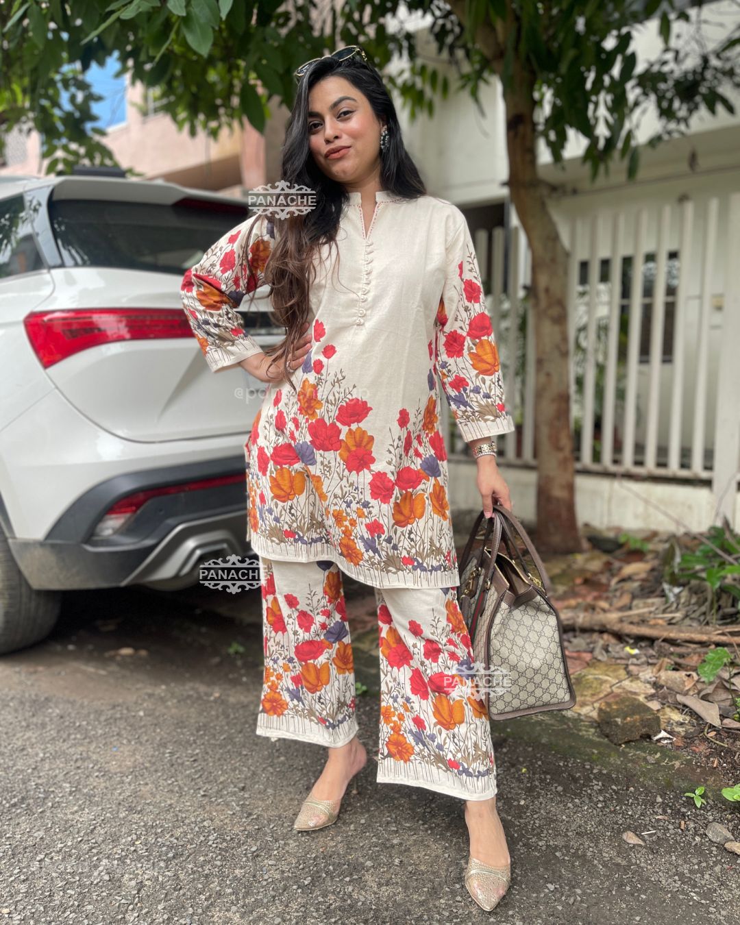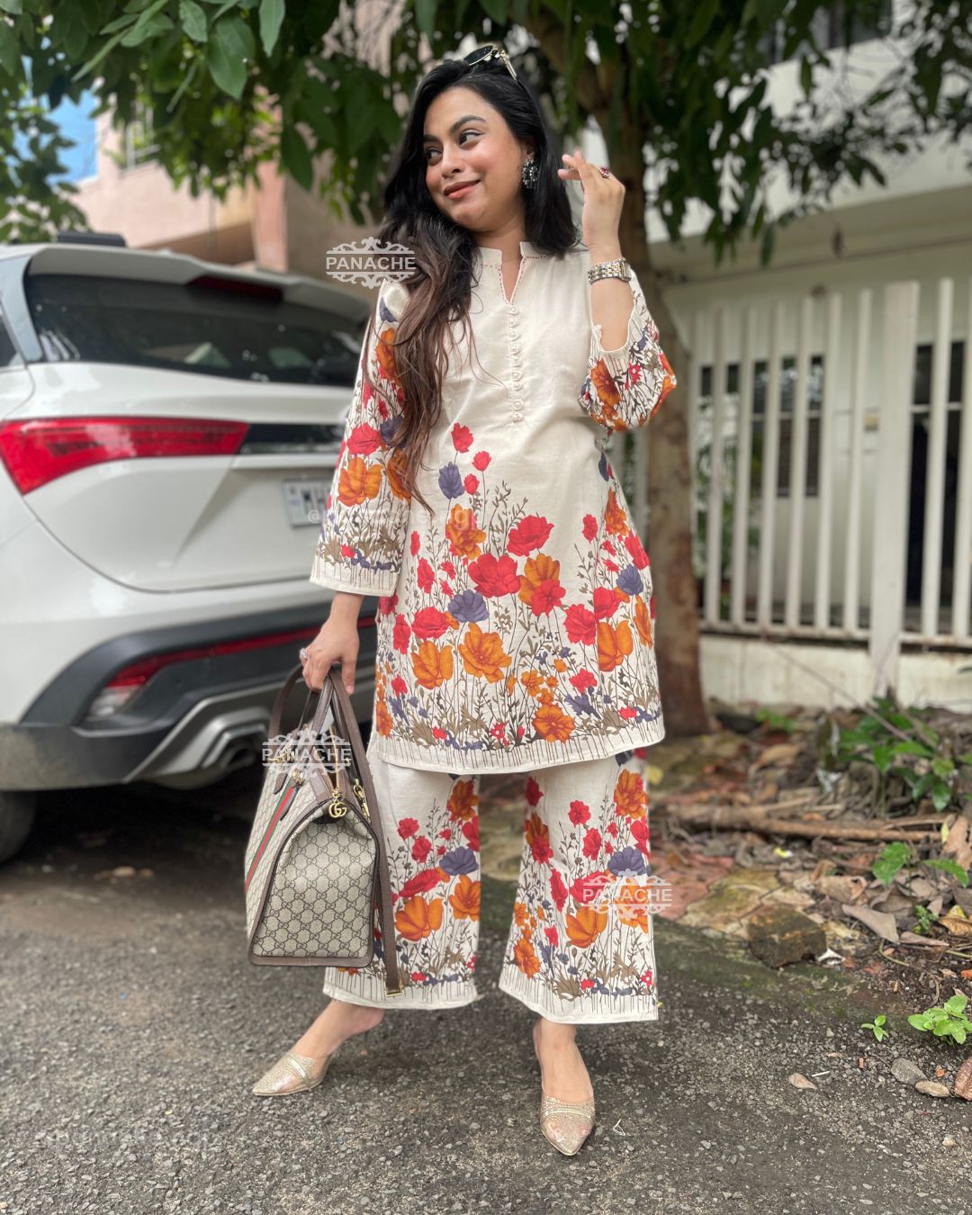🟣 Stand collar with pearl buttons on top with a tropical print in top and plaso set
